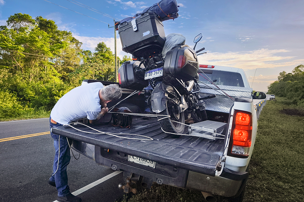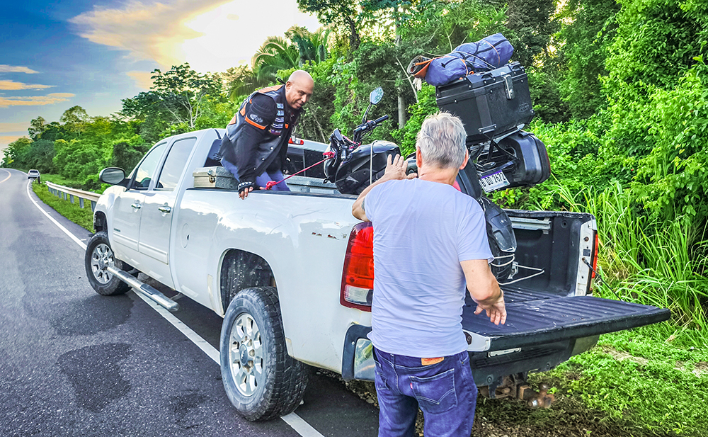 Interestingly, Charly told us he had been riding with a group, but when he broke down, the rest of the group decided to go on without him. I thought this was a very strange decision for his group to make but never mind, we’re here now. I put the ramp in place and the 3 of us were able to to load the bike into the back of my truck.